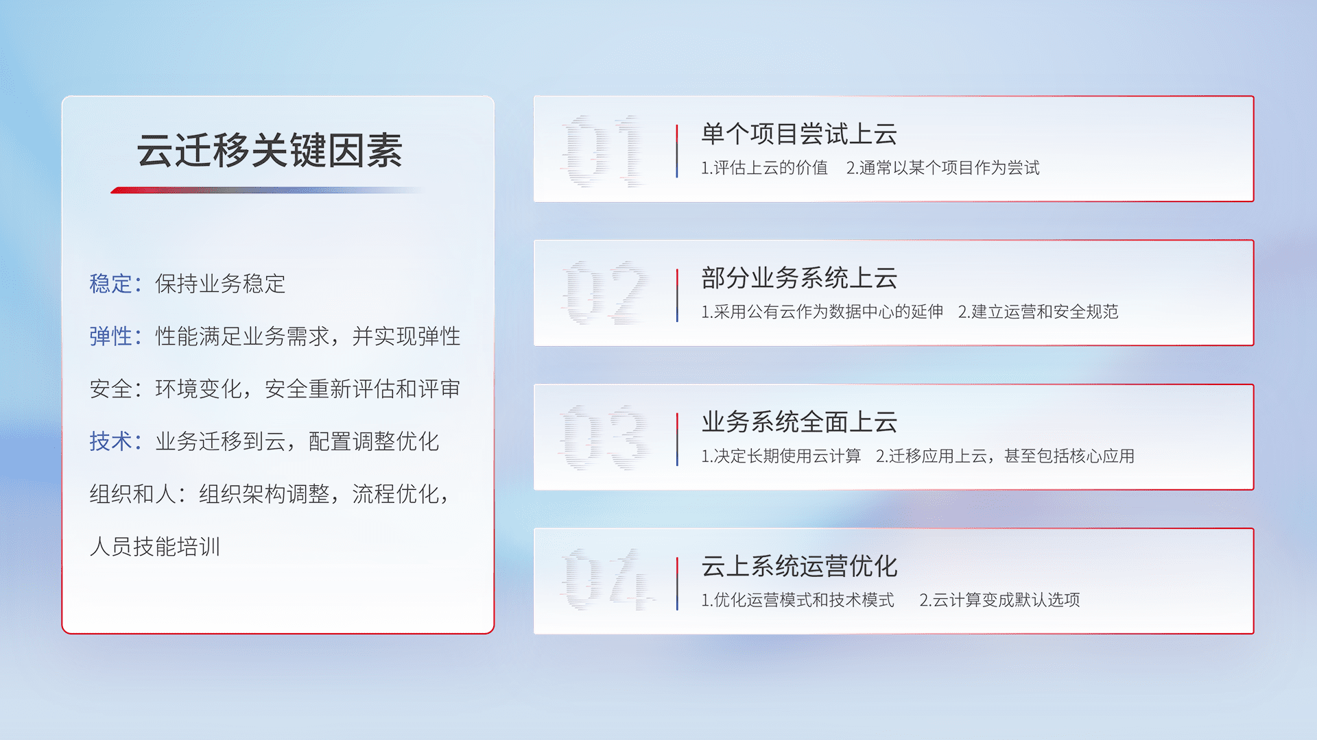 结合实际业务,,从规划设计、、、、云平台选型、、、、云原生改造、、数据迁移、、、集成交付,,迁移全过程为客户识别最佳上云路径,,,做好风险识别管理,,,设计网络架构、、身份权限、、安全审计合规、、操作审计、、、、日志审计、、监控告警策略、、多站点容灾设计等,,,,对云上基础设施进行整体规划,,,,提升IT治理水平,,以满足弹性、、高可用、、、高性能的需求。。